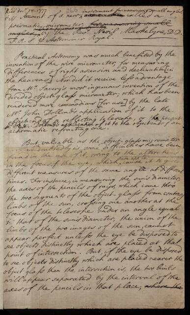 Nevil Maskelyne, Paper, 'Of the prismatic micrometer; with certificates by Alexander Aubert and Peter Dollond' by Nevil Maskelyne, 1777, L&P/6/260, The Royal Society Archives, London, https://makingscience.royalsociety.org/items/l-and-p_6_260/paper-of-the-prismatic-micrometer-with-certificates-by-alexander-aubert-and-peter-dollond-by-nevil-maskelyne, accessed on 12 November 2025