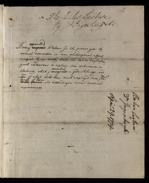 John Ingenhousz, Paper, 'Improvements in electricity [Bakerian Lecture]' by John Ingenhousz, 1779, L&P/7/105, The Royal Society Archives, London, https://makingscience.royalsociety.org/items/l-and-p_7_105/paper-improvements-in-electricity-bakerian-lecture-by-john-ingenhousz, accessed on 08 February 2026