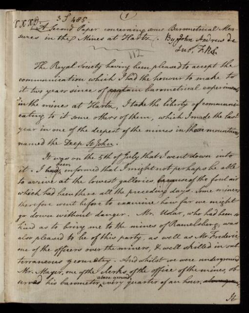 Jean Andre De Luc, Paper, 'Seconde memoire sur les mesures barometriques dans les mines [Second thesis on barometric measurements in mines]' by Jean Andre De Luc, 1779, L&P/7/112, The Royal Society Archives, London, https://makingscience.royalsociety.org/items/l-and-p_7_112/paper-seconde-memoire-sur-les-mesures-barometriques-dans-les-mines-second-thesis-on-barometric-measurements-in-mines-by-jean-andre-de-luc, accessed on 19 January 2026