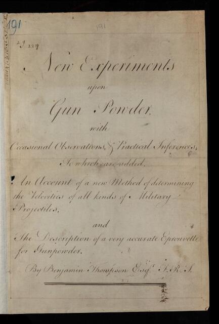 Benjamin Thompson, Paper, 'New experiments on gunpowder' by Benjamin Thompson, 1780, L&P/7/191, The Royal Society Archives, London, https://makingscience.royalsociety.org/items/l-and-p_7_191/paper-new-experiments-on-gunpowder-by-benjamin-thompson, accessed on 08 February 2026