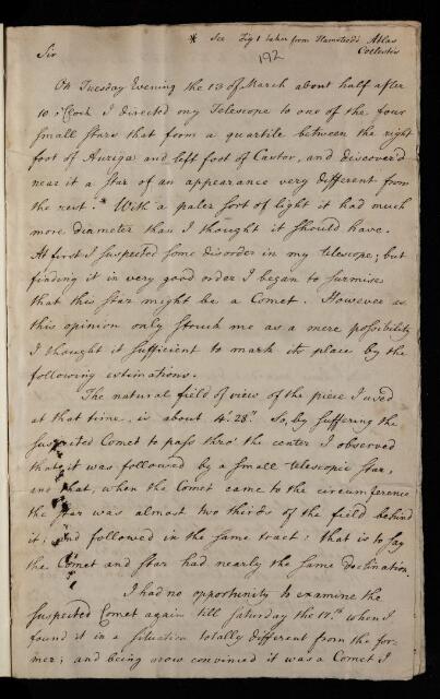 Description of the first recorded observation of the planet Uranus by Sir William Herschel, from Bath. Herschel misidentifies the object as a comet throughout the letter, despite noting similarities with the characteristics of a planet. The categorisation is first proposed by the Astronomer Royal, Nevile Maskelyne then confirmed by other astronomers across Europe. William Herschel will propose in a later letter to name it Georgium Sidus.