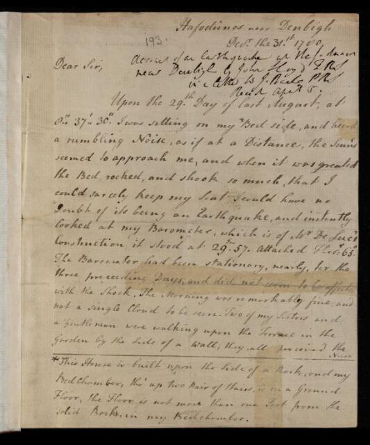 Letter, 'The earthquake at Hafodunos, near Denbigh' from John Lloyd