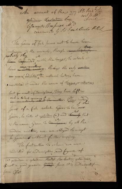 Paper, 'An account of the Ophidium barbatum' by P M A Brussonet, 1781, L&P/7/217, The Royal Society Archives, London, https://makingscience.royalsociety.org/items/l-and-p_7_217/paper-an-account-of-the-ophidium-barbatum-by-p-m-a-brussonet, accessed on 15 February 2026