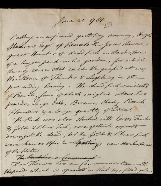 Paper, 'Of dead fish after a thunderstorm' by Michael Lort, 1781, L&P/7/219, The Royal Society Archives, London, https://makingscience.royalsociety.org/items/l-and-p_7_219/paper-of-dead-fish-after-a-thunderstorm-by-michael-lort, accessed on 07 December 2025