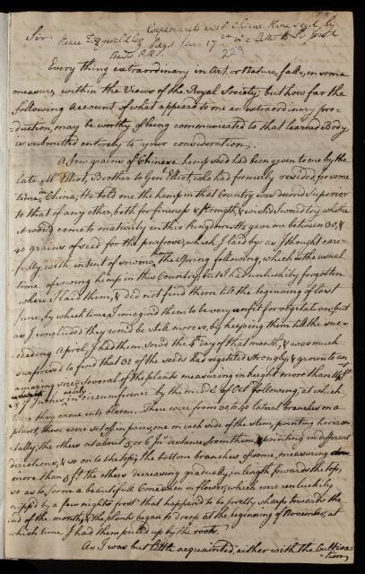 Published in Philosophical Transactions, as 'Experiments with Chinese hemp seed. In a letter from Keane Fitzgerald, Esq. to Sir. Joseph Banks, Bart. F.R.S'