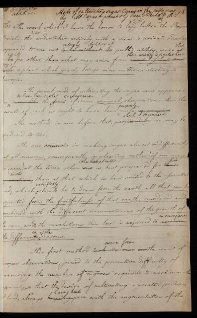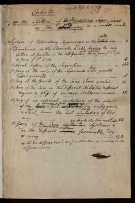 Charles Casaux, Paper, 'Of the system of cultivating sugar-cane on a small scale [First copy]' by Charles Casaux, 1779, L&P/7/266, The Royal Society Archives, London, https://makingscience.royalsociety.org/items/l-and-p_7_266/paper-of-the-system-of-cultivating-sugar-cane-on-a-small-scale-first-copy-by-charles-casaux, accessed on 16 November 2025
