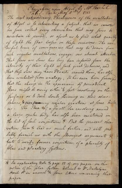 William Herschel, Paper, 'The occultation of Algol' by William Herschel, 1783, L&P/8/27, The Royal Society Archives, London, https://makingscience.royalsociety.org/items/l-and-p_8_27/paper-the-occultation-of-algol-by-william-herschel, accessed on 13 February 2026