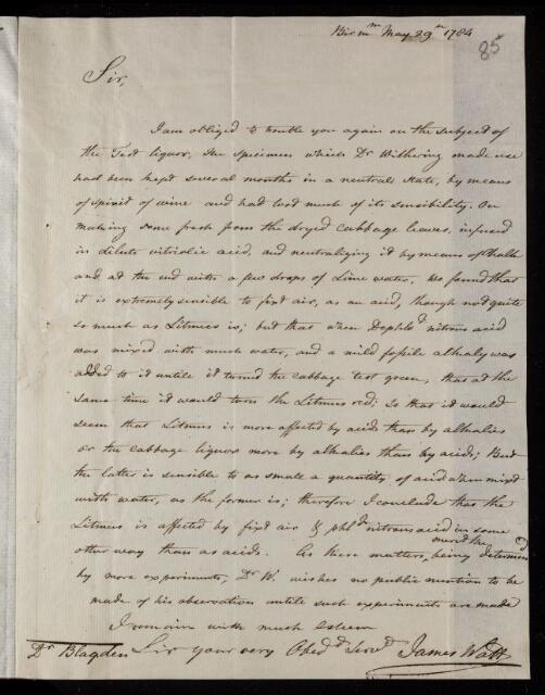 James Watt, Letter, 'On litmus, red cabbage and other test liquors' from James Watt to Charles Blagden, 29 May 1784, L&P/8/85, The Royal Society Archives, London, https://makingscience.royalsociety.org/items/l-and-p_8_85/letter-on-litmus-red-cabbage-and-other-test-liquors-from-james-watt-to-charles-blagden, accessed on 16 March 2026