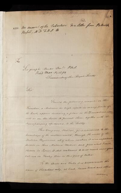 Patrick Russell, Letter, 'An account of the Tabasheer' from Patrick Russell to Joseph Banks, 26 November 1788, L&P/9/162, The Royal Society Archives, London, https://makingscience.royalsociety.org/items/l-and-p_9_162/letter-an-account-of-the-tabasheer-from-patrick-russell-to-joseph-banks, accessed on 09 March 2026