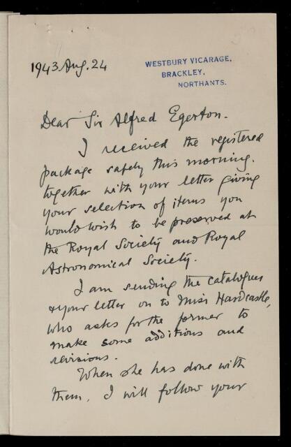 Letter from JCW Herschel, Brackley, to Sir Alfred Egerton, 24 August 1943, MM/14/59, The Royal Society Archives, London, https://makingscience.royalsociety.org/items/mm_14_59/letter-from-jcw-herschel-brackley-to-sir-alfred-egerton, accessed on 20 April 2026