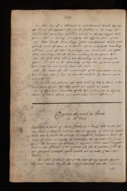 'Exposing a peice of black cloath or a black hatt to the falling Snow I observed such an infinite variety of curiously figured Snow that it would be almost as impossible, to draw skeme of every of them, as exactly to imitate, the curious and Geometrical Mechanisms of Nature in any one. Some course draughts such as the Coldnesse of the weather and the ill provision I had by me for such a purpose, would permit me to make, I have here added