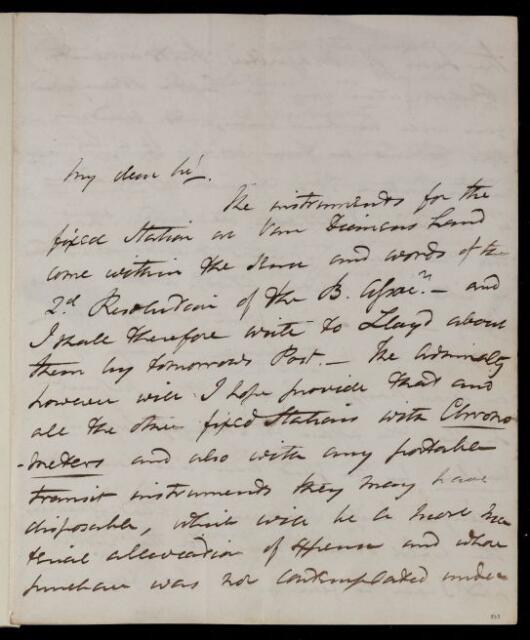 Refers to instruments for the fixed observatory at [Tasmania; Lutruwita or Truwana, colonial Van Diemen’s Land]. Herschel hopes the Admiralty will provide all fixed stations with chronometers and portable transit instruments. Fears that naval expedition will be detained.
