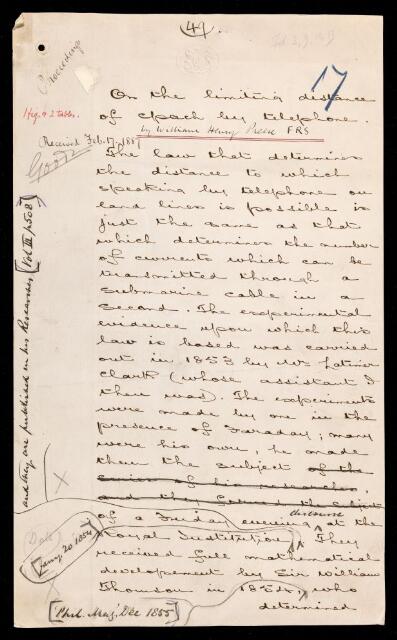 William Henry Preece, Paper, 'On the limiting distance of speech by telephone' by W H [William Henry] Preece, 1887, PP/10/17, The Royal Society Archives, London, https://makingscience.royalsociety.org/items/pp_10_17/paper-on-the-limiting-distance-of-speech-by-telephone-by-w-h-william-henry-preece, accessed on 18 April 2026