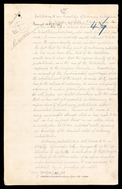 Carl Johann Philipp Noé Richard Anschütz, P Norman Evans, Paper, 'Contributions to our knowledge of antimony pentachloride' by Richard Anschütz and P Norman Evans, 1887, PP/10/46, The Royal Society Archives, London, https://makingscience.royalsociety.org/items/pp_10_46/paper-contributions-to-our-knowledge-of-antimony-pentachloride-by-richard-anschütz-and-p-norman-evans, accessed on 14 November 2025