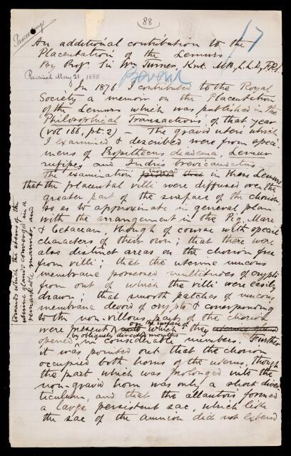 William Turner, Paper, 'An additional contribution to the placentation of the lemurs' by William Turner, 1888, PP/12/16, The Royal Society Archives, London, https://makingscience.royalsociety.org/items/pp_12_16/paper-an-additional-contribution-to-the-placentation-of-the-lemurs-by-william-turner, accessed on 16 March 2026