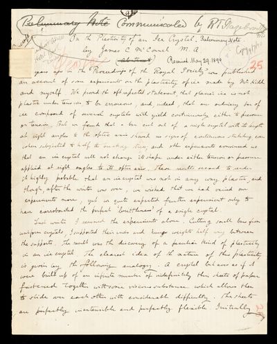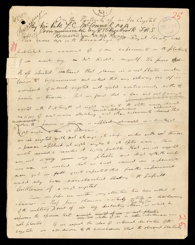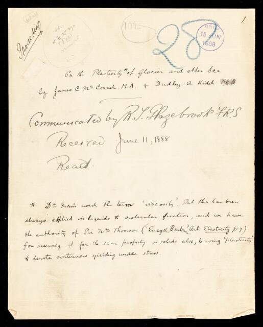 James C McConnel, Dudley A Kidd, Paper, 'On the plasticity of glacier and other ice' by James C McConnel and Dudley A Kidd, 1888, PP/12/26, The Royal Society Archives, London, https://makingscience.royalsociety.org/items/pp_12_26/paper-on-the-plasticity-of-glacier-and-other-ice-by-james-c-mcconnel-and-dudley-a-kidd, accessed on 06 December 2025