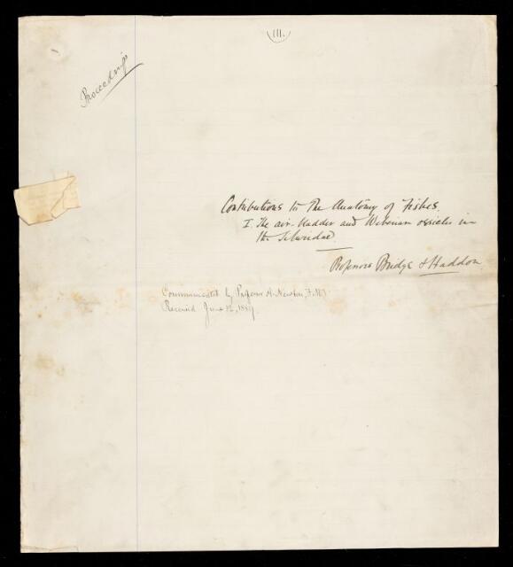 Thomas William Bridge, Alfred Cort Haddon, Paper, 'Contribution to the anatomy of fishes. I. The air-bladder and Weberian ossicles in the Siluridae' by Thomas William Bridge and Alfred Cort Haddon, 1889, PP/14/26, The Royal Society Archives, London, https://makingscience.royalsociety.org/items/pp_14_26/paper-contribution-to-the-anatomy-of-fishes-i-the-air-bladder-and-weberian-ossicles-in-the-siluridae-by-thomas-william-bridge-and-alfred-cort-haddon, accessed on 12 February 2026