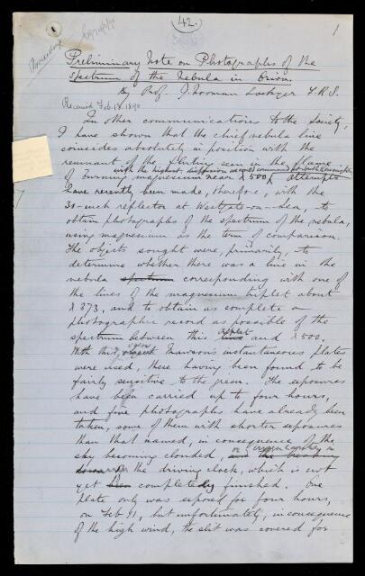 Joseph Norman Lockyer, Paper, 'Preliminary note on photographs of the spectrum of the nebula in Orion' by J [Joseph] Norman Lockyer, 1890, PP/16/18, The Royal Society Archives, London, https://makingscience.royalsociety.org/items/pp_16_18/paper-preliminary-note-on-photographs-of-the-spectrum-of-the-nebula-in-orion-by-j-joseph-norman-lockyer, accessed on 17 February 2026