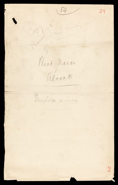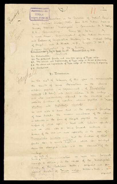 Alfred William Alcock, J Wood-Mason, Paper, 'Further observations on the gestation of Indian rays, being natural history notes from H. M. Indian Marine Survey Steamer "Investigator"' by J Wood-Mason and Alfred William Alcock, 1891, PP/18/10, The Royal Society Archives, London, https://makingscience.royalsociety.org/items/pp_18_10/paper-further-observations-on-the-gestation-of-indian-rays-being-natural-history-notes-from-h-m-indian-marine-survey-steamer-investigator-by-j-wood-mason-and-alfred-william-alcock, accessed on 15 April 2026