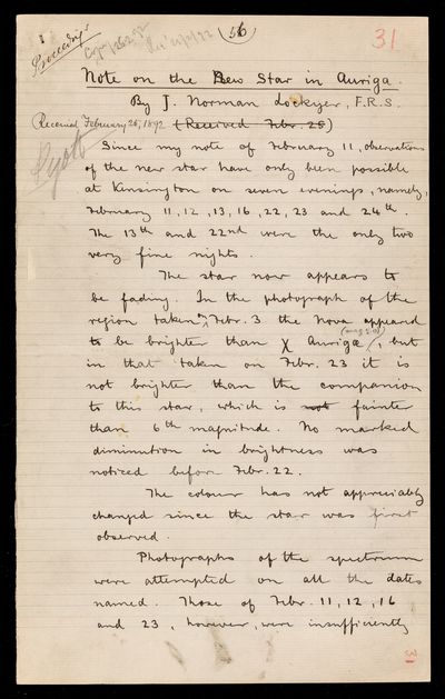 Joseph Norman Lockyer, Paper, 'On the new star in Auriga. Preliminary note' by Joseph Norman Lockyer, 1892, PP/18/24, The Royal Society Archives, London, https://makingscience.royalsociety.org/items/pp_18_24/paper-on-the-new-star-in-auriga-preliminary-note-by-joseph-norman-lockyer, accessed on 06 March 2026