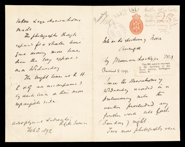 Joseph Norman Lockyer, Paper, 'Note on the spectrum of Nova Aurigae' by Joseph Norman Lockyer, 1892, PP/18/26, The Royal Society Archives, London, https://makingscience.royalsociety.org/items/pp_18_26/paper-note-on-the-spectrum-of-nova-aurigae-by-joseph-norman-lockyer, accessed on 14 April 2026