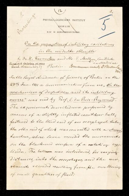 Karl Hugo Kronecker, S Meltzer, Paper, 'On the propagation of inhibitory excitation in the medulla oblongata' by H [Hugo] Kronecker and S Meltzer, 1881, PP/1/5, The Royal Society Archives, London, https://makingscience.royalsociety.org/items/pp_1_5/paper-on-the-propagation-of-inhibitory-excitation-in-the-medulla-oblongata-by-h-hugo-kronecker-and-s-meltzer, accessed on 14 February 2026