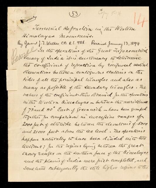 James Thomas Walker, Paper, 'Terrestrial refraction in the Western Himalayan Mountains' by James Thomas Walker, 12 January 1894, PP/23/13, The Royal Society Archives, London, https://makingscience.royalsociety.org/items/pp_23_13/paper-terrestrial-refraction-in-the-western-himalayan-mountains-by-james-thomas-walker, accessed on 12 February 2026