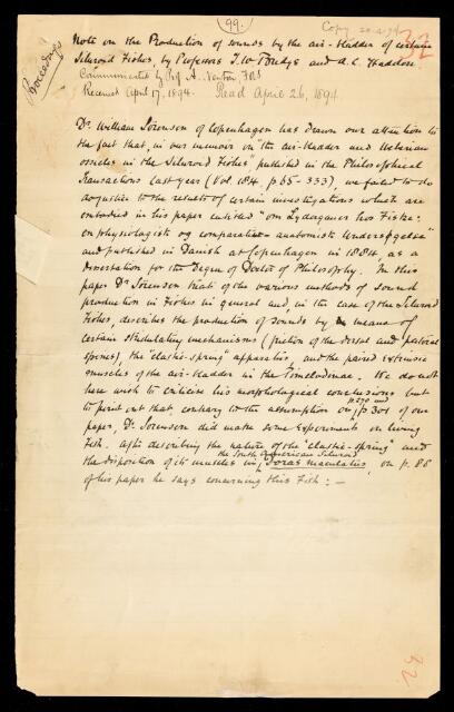 Alfred Cort Haddon, Thomas William Bridge, Paper, 'Note on the production of sounds by the air-bladder of certain siluroid fishes' by Thomas William Bridge and Alfred Cort Haddon, 1894, PP/23/31, The Royal Society Archives, London, https://makingscience.royalsociety.org/items/pp_23_31/paper-note-on-the-production-of-sounds-by-the-air-bladder-of-certain-siluroid-fishes-by-thomas-william-bridge-and-alfred-cort-haddon, accessed on 16 March 2026