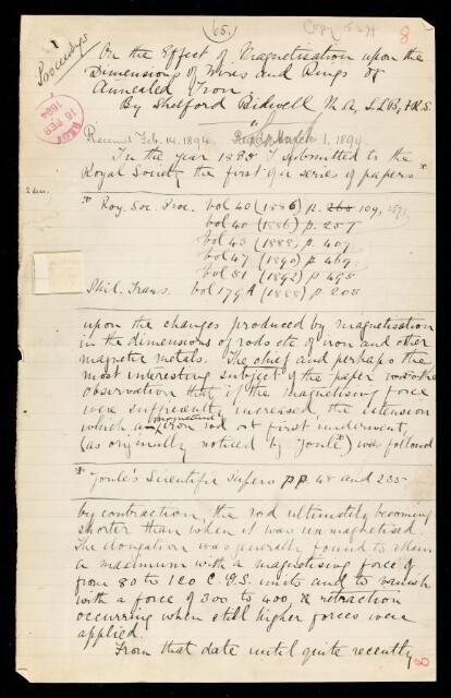 Shelford Bidwell, Paper, 'On the effect of magnetisation upon the dimensions of wires and rings of annealed iron' by Shelford Bidwell, 1894, PP/24/7, The Royal Society Archives, London, https://makingscience.royalsociety.org/items/pp_24_7/paper-on-the-effect-of-magnetisation-upon-the-dimensions-of-wires-and-rings-of-annealed-iron-by-shelford-bidwell, accessed on 24 January 2026