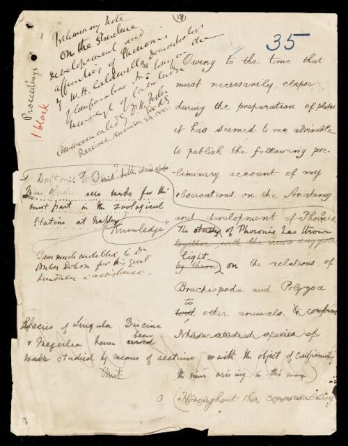 Paper, 'Preliminary note on the structure, development, and affinities of phoronis [horseshoe worm]' by W H Caldwell, 1882, PP/2/33, The Royal Society Archives, London, https://makingscience.royalsociety.org/items/pp_2_33/paper-preliminary-note-on-the-structure-development-and-affinities-of-phoronis-horseshoe-worm-by-w-h-caldwell, accessed on 12 December 2025