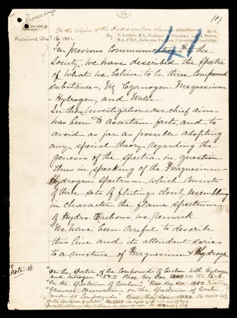 George Downing Liveing, James Dewar, Paper, 'On the origin of the hydro-carbon flame spectrum' by [George Downing] Liveing and [James] Dewar, 1882, PP/2/39, The Royal Society Archives, London, https://makingscience.royalsociety.org/items/pp_2_39/paper-on-the-origin-of-the-hydro-carbon-flame-spectrum-by-george-downing-liveing-and-james-dewar, accessed on 22 April 2026