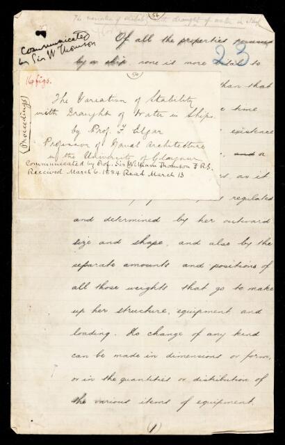 Francis Elgar, Unpublished paper, 'The variation of stability with draught of water in ships' by F [Francis] Elgar, 1884, PP/5/19, The Royal Society Archives, London, https://makingscience.royalsociety.org/items/pp_5_19/unpublished-paper-the-variation-of-stability-with-draught-of-water-in-ships-by-f-francis-elgar, accessed on 11 April 2026