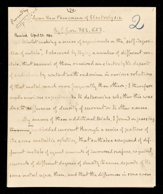 George Gore, Paper, 'Some new phenomena of electrolysis' by G [George] Gore, 1884, PP/5/2, The Royal Society Archives, London, https://makingscience.royalsociety.org/items/pp_5_2/paper-some-new-phenomena-of-electrolysis-by-g-george-gore, accessed on 18 January 2026