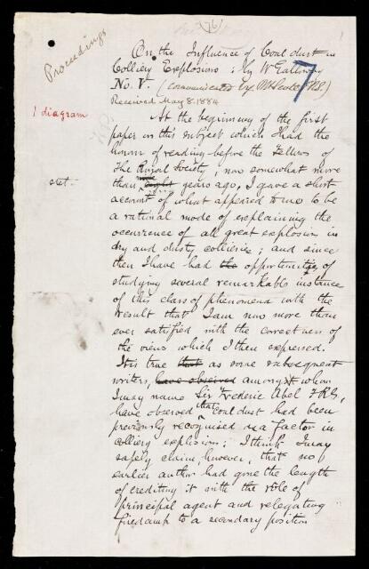 Sir; William Galloway, Paper, 'On the influence of coal-dust in colliery explosions. No. V' by W [William] Galloway, 1884, PP/5/7, The Royal Society Archives, London, https://makingscience.royalsociety.org/items/pp_5_7/paper-on-the-influence-of-coal-dust-in-colliery-explosions-no-v-by-w-william-galloway, accessed on 10 November 2025