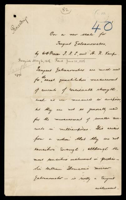 William Henry Preece, H R Kempe, Paper, 'On a new scale for tangent galvanometers' by W H [William Henry] Preece and H R Kempe, 1886, PP/8/32, The Royal Society Archives, London, https://makingscience.royalsociety.org/items/pp_8_32/paper-on-a-new-scale-for-tangent-galvanometers-by-w-h-william-henry-preece-and-h-r-kempe, accessed on 12 February 2026