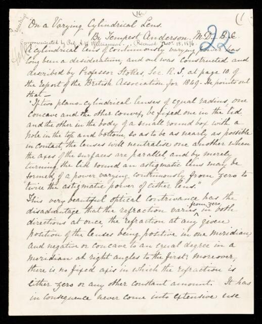 Tempest Anderson, Paper, 'On a varying cylindrical lens' by Tempest Anderson, 1886, PP/9/18, The Royal Society Archives, London, https://makingscience.royalsociety.org/items/pp_9_18/paper-on-a-varying-cylindrical-lens-by-tempest-anderson, accessed on 13 November 2025