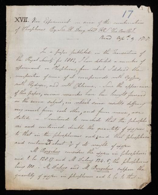 Humphry Davy, Paper, 'New experiments on some of the combinations of phosphorus' by Sir H [Humphry] Davy, 1818, PT/12/17, The Royal Society Archives, London, https://makingscience.royalsociety.org/items/pt_12_17/paper-new-experiments-on-some-of-the-combinations-of-phosphorus-by-sir-h-humphry-davy, accessed on 20 January 2026
