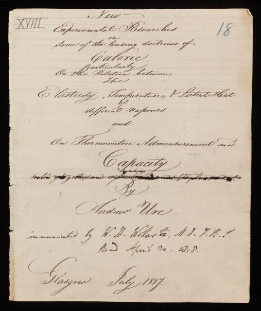 Andrew Ure, Paper, 'New experimental researches on some of the leading doctrines of caloric particularly on the relation between the elasticity, temperature, and latent heat of different vapours and on thermometric admeasurement and capacity' by Andrew Ure, 01 July 1817, PT/12/18, The Royal Society Archives, London, https://makingscience.royalsociety.org/items/pt_12_18/paper-new-experimental-researches-on-some-of-the-leading-doctrines-of-caloric-particularly-on-the-relation-between-the-elasticity-temperature-and-latent-heat-of-different-vapours-and-on-thermometric-admeasurement-and-capacity-by-andrew-ure, accessed on 14 February 2026