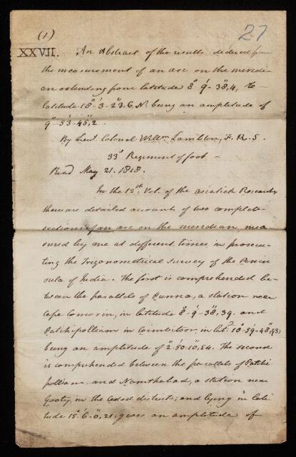William Lambton, Paper, 'An abstract of the results deduced from the measurement of an arc on the meridian extending from latitude 8° 9' 38".4, to latitude 18° 3' 23".6 N., being an amplitude of 9° 53' 45".2' by Lieut Colonel Willm [William] Lambton, 1818, PT/12/27, The Royal Society Archives, London, https://makingscience.royalsociety.org/items/pt_12_27/paper-an-abstract-of-the-results-deduced-from-the-measurement-of-an-arc-on-the-meridian-extending-from-latitude-8-9-384-to-latitude-18-3-236-n-being-an-amplitude-of-9-53-452-by-lieut-colonel-willm-william-lambton, accessed on 09 March 2026