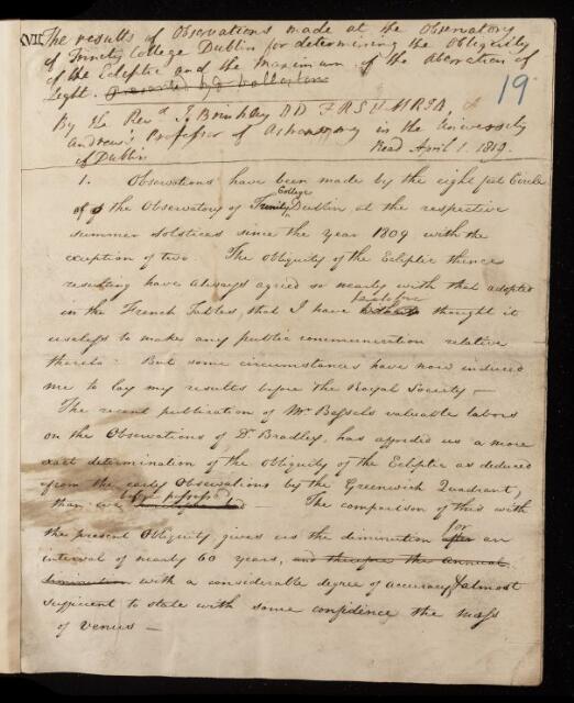John Brinkley, Paper, 'The results of observations made at the Observatory of Trinity College Dublin for determining the obliquity of the ecliptic and the maximum of the aberration of light' by Rev J [John] Brinkley, 1819, PT/13/19, The Royal Society Archives, London, https://makingscience.royalsociety.org/items/pt_13_19/paper-the-results-of-observations-made-at-the-observatory-of-trinity-college-dublin-for-determining-the-obliquity-of-the-ecliptic-and-the-maximum-of-the-aberration-of-light-by-rev-j-john-brinkley, accessed on 06 November 2025