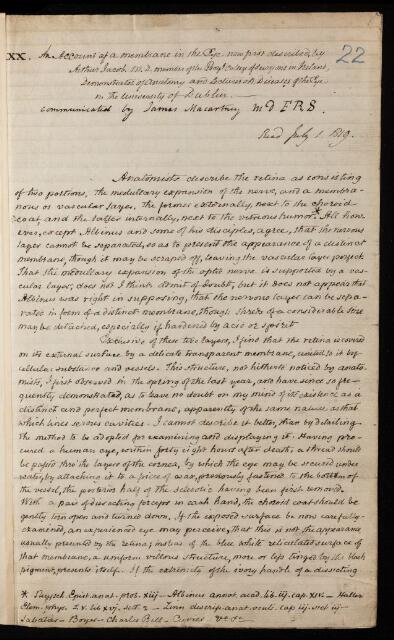 Arthur Jacob, Paper, 'An account of a membrane in the eye now first described' by Arthur Jacob, 1819, PT/13/22, The Royal Society Archives, London, https://makingscience.royalsociety.org/items/pt_13_22/paper-an-account-of-a-membrane-in-the-eye-now-first-described-by-arthur-jacob, accessed on 10 November 2025