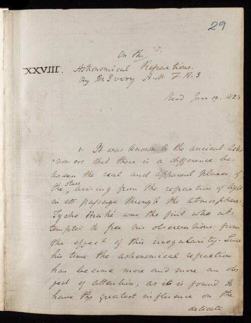 James Ivory, Paper, 'On the astronomical refractions' by J [James] Ivory, 1823, PT/16/29, The Royal Society Archives, London, https://makingscience.royalsociety.org/items/pt_16_29/paper-on-the-astronomical-refractions-by-j-james-ivory, accessed on 12 December 2025