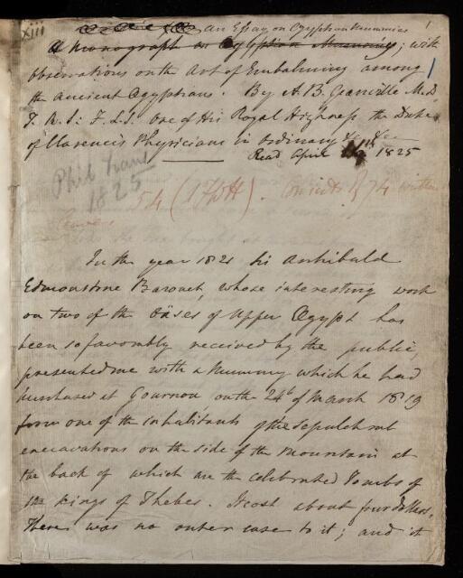 Augustus Bozzi Granville, Paper, 'An essay on Egyptian mummies; with observations on the art of embalming among the ancient Egyptians' by A B [Augustus Bozzi] Granville, 1825, PT/18/1, The Royal Society Archives, London, https://makingscience.royalsociety.org/items/pt_18_1/paper-an-essay-on-egyptian-mummies-with-observations-on-the-art-of-embalming-among-the-ancient-egyptians-by-a-b-augustus-bozzi-granville, accessed on 11 March 2026