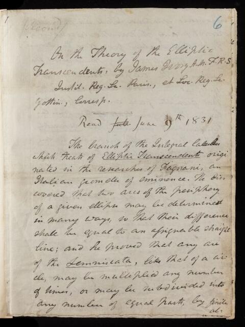 James Ivory, Paper, 'On the theory of the elliptic transcendents' by James Ivory, 1831, PT/19/6, The Royal Society Archives, London, https://makingscience.royalsociety.org/items/pt_19_6/paper-on-the-theory-of-the-elliptic-transcendents-by-james-ivory, accessed on 25 January 2026
