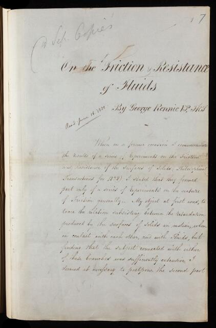 George Rennie, Paper, 'On the friction and resistance of fluids' by George Rennie, 1831, PT/19/7, The Royal Society Archives, London, https://makingscience.royalsociety.org/items/pt_19_7/paper-on-the-friction-and-resistance-of-fluids-by-george-rennie, accessed on 12 December 2025