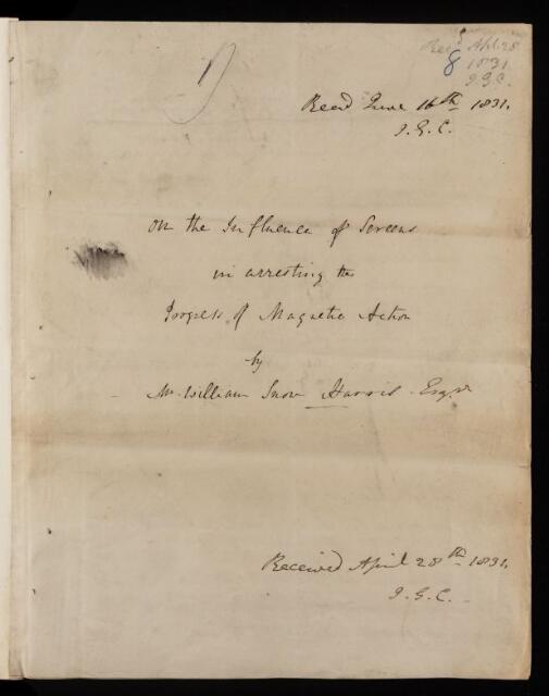 William Snow Harris, Paper, 'On the influence of screens in arresting the process of magnetic action' by Mr William Snow Harris, 03 April 1831, PT/19/8, The Royal Society Archives, London, https://makingscience.royalsociety.org/items/pt_19_8/paper-on-the-influence-of-screens-in-arresting-the-process-of-magnetic-action-by-mr-william-snow-harris, accessed on 18 January 2026