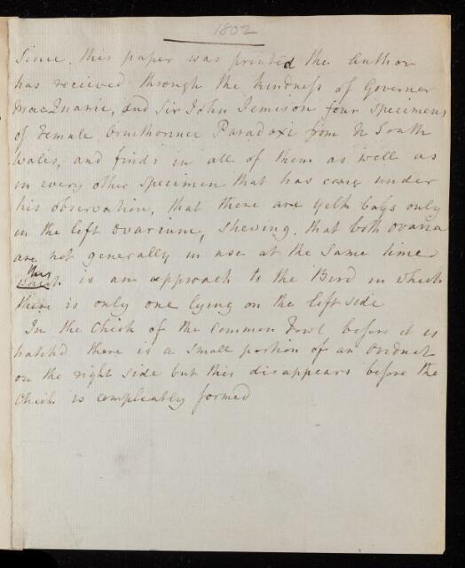 Manuscript notes describing new developments in Everard Home's research on anatomy of the ovaries of the female ornithorhynchus paradoxus after receiving specimens from Governor [Lachlan] MacQuarie and Sir John Jemison. Notes refer to the author in the third person but may be written by Home. Manuscript ends mid-sentence.