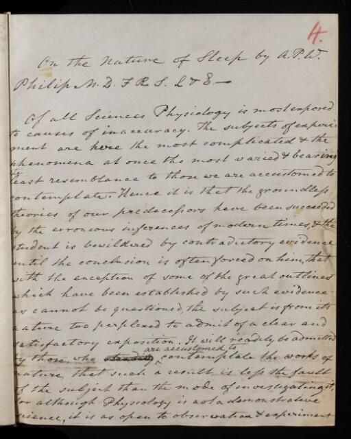 Alexander Philip Wilson Philip, Paper, 'On the nature of sleep' by A P W [Alexander Philip Wilson] Philip, 1833, PT/21/4, The Royal Society Archives, London, https://makingscience.royalsociety.org/items/pt_21_4/paper-on-the-nature-of-sleep-by-a-p-w-alexander-philip-wilson-philip, accessed on 07 December 2025