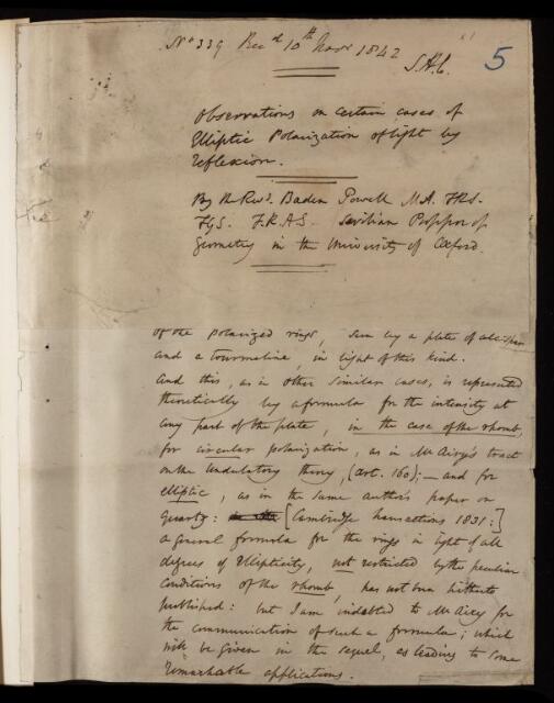 Baden Powell, Paper, 'Observations on certain cases of elliptic polarization of light by reflexion' by Rev Baden Powell, 1842, PT/27/5, The Royal Society Archives, London, https://makingscience.royalsociety.org/items/pt_27_5/paper-observations-on-certain-cases-of-elliptic-polarization-of-light-by-reflexion-by-rev-baden-powell, accessed on 24 January 2026