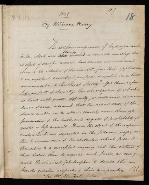 William Henry, Paper, ['Description of an apparatus for the analysis of the compound inflammable gases by slow combustion; with experiments on the gas from coal, explaining application'] by William Henry, 19 May 1808, PT/2/18, The Royal Society Archives, London, https://makingscience.royalsociety.org/items/pt_2_18/paper-description-of-an-apparatus-for-the-analysis-of-the-compound-inflammable-gases-by-slow-combustion-with-experiments-on-the-gas-from-coal-explaining-application-by-william-henry, accessed on 21 January 2026